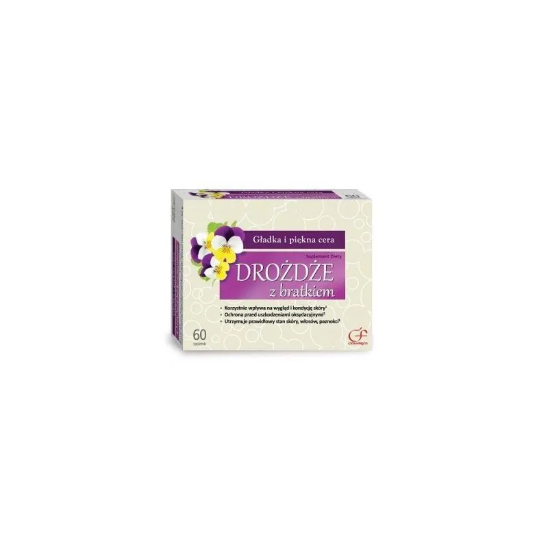 Suplement diety Drożdże z bratkiem korzystnie wpływa na poprawę wyglądu skóry. Przeznaczony jest dla osób, którym zależy na ładnej cerze. W skład produktu wchodzi wyciąg z fiołka trójbarwnego zwanego potocznie bratkiem, oraz witamina E, która jest antyutleniaczem i ma za zadanie chronić organizm przed wpływem wolnych rodników tlenowych