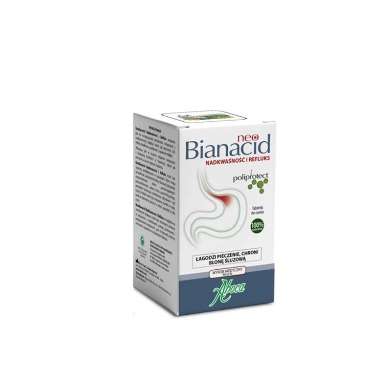 NeoBianacid Nadkwaśność i Refluks wskazany jest do rozwiązywania problemów związanych z nadkwaśnością żołądka, takich jak pieczenie, ból, refluks żołądkowo‑przełykowy i zapalenie żołądka Wskazany jest w leczeniu objawów związanych z dyspepsją (trudności w trawieniu), takich jak pieczenie, uczucie ciężkości i bębnica.