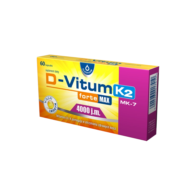 Witamina K, podobnie jak witamina D, pomaga w utrzymaniu zdrowych kości. Organizm człowieka nie jest w stanie samodzielnie syntetyzować witaminy K2, w związku z czym zapotrzebowanie na tę witaminę pokrywane jest głównie z dietą oraz w mniejszym stopniu dzięki syntezie prowadzonej przez bakterie jelitowe. D-Vitum Forte Max 4000 j.m. K2 zawiera w swoim składzie witaminę K2-menachinon-7 (MK-7). Ma to istotne znaczenie, ponieważ właśnie ta forma chemiczna witaminy K bierze udział w metabolizmie kostnym.